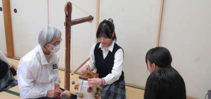 3年生は、京都の伝統工芸「京くみひも」の作成体験を行いました。京くみひも工業協同組合から10名以上の講師をお招きし、独特の工具を使って、正座で集中しながら作業に取り組みました。最初は戸惑いもありましたが、次第に手順を理解し、美しい絹糸を組み上げていく姿が印象的でした。金具の取り付けは講師の方にお願いしましたが、生徒たちは自分の手で完成させた達成感に満ちていました。完成品は、東京FWで交流する留学生への贈り物として持参します。国際交流の場で、日本の伝統文化を伝える貴重な機会となります。ある生徒が「贈り物として良いけれど、せっかくなので自分にも…」とつぶやいたように、心に残る体験となりました。