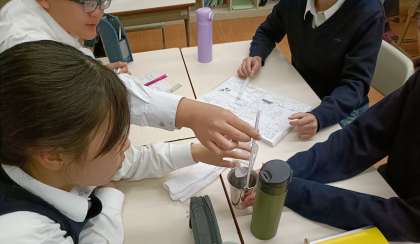 教室の室温を測定した後、金属製のコップに汲み置きの水を入れ、水温を測定しました。