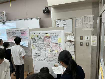 北海道地方について、自然環境に着目し、農林水産業、鉱工業、歴史・文化などの視点から、強み・弱みを分析したことを基に、本時の問いにむかっていました。本時の問いは、「北海道がより活力に溢れる、北海道の可能性が連鎖する取組を提案せよ!」。抽象的な言葉から、「活力が溢れる」ってどういう状況をいうんだろうか。可能性が連鎖するってどんな状態になることなのかな。と思考を深めていく姿がそれぞれの班で見られました。