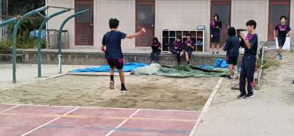 体育の授業において、運動技能の向上と主体的な学びの姿勢を育むことを目的に、ハードル走と幅跳びの練習を行いました。生徒たちは2つのグループに分かれ、基礎的な動作の確認を行った後、タブレットを活用して自身の動きを録画しました。録画した映像を見ながら、見本と比較し、課題を明確にしたうえで動作の修正に取り組みました。その後、記録の計測も行い、成果を確認しました。思い通りに跳ぶことは容易ではありませんが、生徒たちは一つひとつの課題に真剣に向き合い、目標達成に向けて努力を重ねていました。