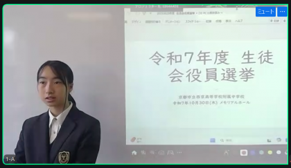 インフルエンザをはじめ感染症が広がりつつある中、全校をメモリアルホールに集めるのを避け、急きょZoomによる遠隔放映による立会演説に切り替えました。選挙管理委員長をはじめ選挙管理委員のみなさんにより、前日準備もなかったにもかかわらず、手際よくZoomのセッティングから会の進行までスムースに進めることができました。また、立候補者のみなさんも、今日この日に向け準備を重ねてきたことでしょうが、急な変更にもかかわらず対応できるのはさすがです。それぞれが自分たちの西京をよりよくするため、自分事として真剣に考えていることが伝わってきました。堂々と自分の思いを伝えていました。対面からZoomに変わったことで、急きょ原稿を差し替える臨機応変な対応など、個々魅力あふれる演説でした。