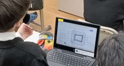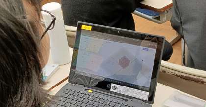 立体を動かした軌跡の体積を求めます。球や円柱、円錐を一定の条件のもと動かします。移動させてできる立体を想像することが難しく、見取り図をうまくノートに書きだすことができないと、体積を求めることができません。今回は、GeoGebraを使って立体を想像するためのツールとして活用しました。GeoGebraは、条件を数式で入力する必要があるので、適当に合わせていくことができません。見通しが必要になります。その分、出来上がった図は美しく、色分けしたり、いろいろな角度から見ることもできます。思考を進めるだけでなく説明するのにも一躍買っていました。まさにICTを文房具のように使った一例ですね。