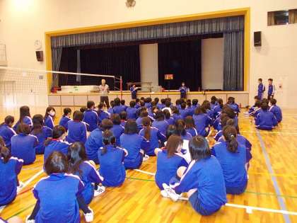 下の写真にもあるように、まずは全体で開会式をおこない、体育委員が選手宣誓をした後に、男子はグラウンドでハンドボール、女子はアリーナでバレーボールを競技して親睦を深めました。