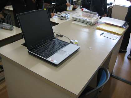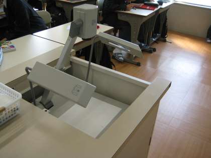 情報機器が充実しています。ノートパソコンはもちろんのこと,液晶ビジョン・教材提示装置・ビデオ等が設置されており,すべて教室前方のスクリーンに映し出すことができます。