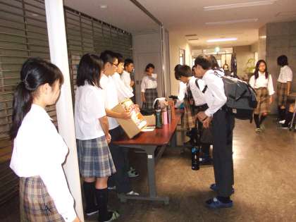 具体的には、朝、登校時の時間帯に、机に落し物を並べて呼びかけをしています。その結果、現時点で約25個の落し物を持ち主のところへ返すことができ、代表委員の生徒もこの取組をやった甲斐があったと感じることが出来ています。また、物を大切にすることを再確認できる機会にもなったと思います。