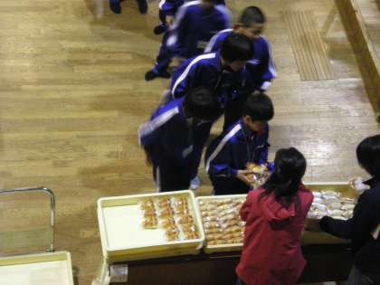 夜に予定していた天体観測は,天候の関係で中止になりました。その代わりに,副校長先生が,星や宇宙に関するお話をしてくださいました。お話の後は,補食タイム。班ごとにパンと飲み物を受け取り,小腹を満たすことができました。