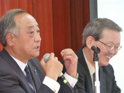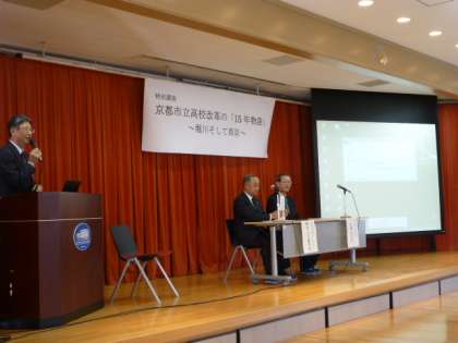 講演には、京都市教育委員会教育企画監・前京都市立堀川高等学校校長の荒瀬克己氏、京都嵯峨芸術大学教授・前京都市立西京高等学校・附属中学校校長の関目六左衞門氏をお招きし、「京都市立高校改革の『15年物語』〜堀川そして西京〜」と題して、ご講演とご対談をしていただきました。