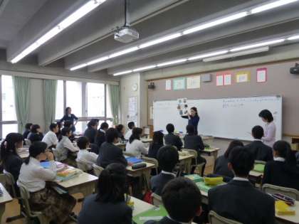 1限目、2限目は英語の授業を参観していただきました(写真上は1年A組の様子です)。そのあとで、本校の教育内容についてご説明をし、質疑の時間をとりました。