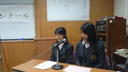 本校の放送部の3年Mu.Naさんが司会を務め,3年A.Hiさんがい順朗読を担当しコンクールへは3名が出場し、2年 Ya.Miさんが優秀賞を受賞しました。