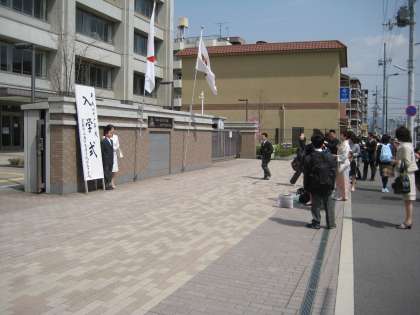 *例年見られる光景です。入学式の立て看板の横での記念撮影の順番待ち。