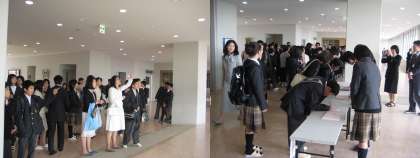 *学級発表の名簿を記念に撮影する姿も…。受付をすませた新入生は控室へ。