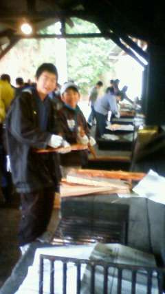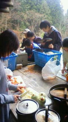 花背からのメール第二弾! 雨の中,野外炊飯が始まったようです。各班ごとに,火の係,おかず係,ご飯係に分かれて,分担した仕事に一生懸命取り組んでいます。