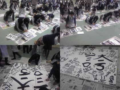最初にロータリークラブ様のテーマである「精励・誠実・謙虚」の3つの語を個人で練習した後,参加者全員での大型書道にも取り組みました。本校の生徒達は,今年度のローターアクトクラブのテーマである「誇」の部分を担当しました。青少年交換制度で来日している留学生とも協力して見事完成させ,留学生や他校生との交流を楽しみました。このような意義深い機会を与えてくださった京都西ロータリークラブ様に重ねて感謝申し上げます。本当にありがとうございました。
