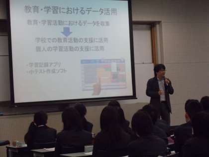 本日4限、本校大講義室に京都外国語大学の村上正行教授をお招きし,3年生に向けて情報モラルに関しての講義をおこないました。