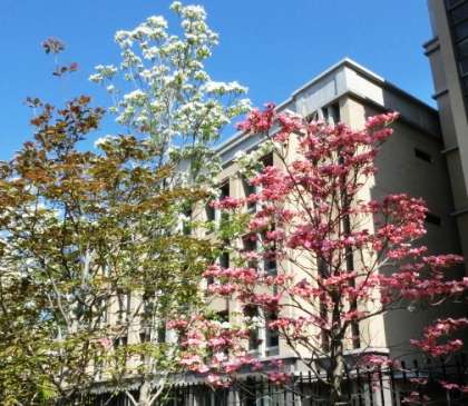 ※今日は、とても穏やかな日で、春らしい陽気になりました。 本校の御池通側にある、「ハナミズキ」や「五月」も、この日を待っていたかのように色づいています。