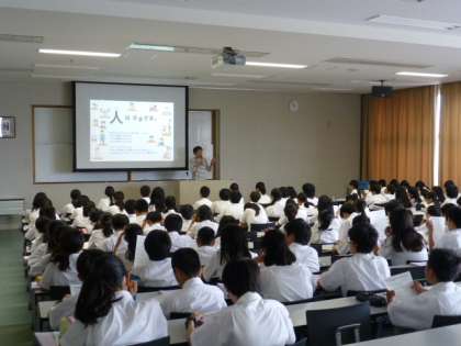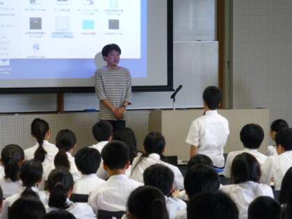 だれでも公平に利用できるものである自動ドア(センサー)や地下鉄の点字ブロック、使い方を選べるボールペンなどの文具類、情報を瞬時に見てとれるピクトグラムなどをはじめ、写真を用いてたくさんの例を提示しながら、たいへんわかりやすいご講演で、50分があっという間に過ぎ去ってしまいました。“ピクトグラムは世界共通の表示ですか”など、生徒からの質問もあり、考えを深めることができました。このあと、生徒達は、それぞれ、アイデアをしぼり、自分なりに、“ユニバーサルデザイン”を考えてみる予定です。どのようなものが発案されるか、楽しみです。