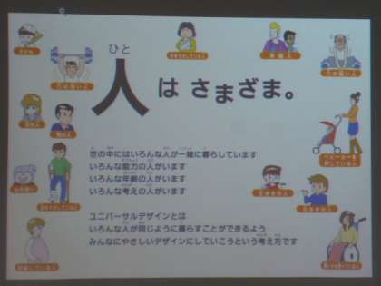 「世の中にはいろんな人が一緒に暮らしています。いろんな能力の人がいます。いろんな年齢の人がいます。いろんな考えの人がいます。ユニバーサルデザイン(UD)とは、いろんな人が同じように暮らすことができるよう、みんなにやさしいデザインにしていこうという考え方です。