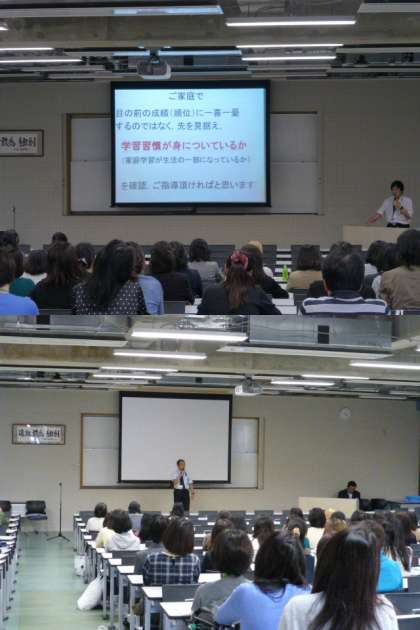 学年懇談会は、7階大講義室にておこなわれました。学年主任から、「団結・思いやり」をあいことばにスタートした12期生の、4月から現在までの、学校での様子を話しました。先日のオープンキャンパスでの1年生の頑張りや、今、いっしょうけんめい頑張ることの意味・1年生の課題などをお伝えしました。
