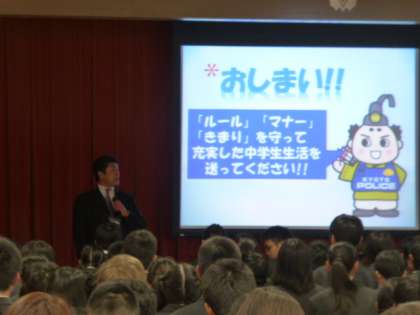本日4限、本校7階メモリアルホールにおいて、1,2年生を対象に、京都市教育委員会より石塚生徒指導課担当課長様にご来校いただき、非行防止教室をおこないました。中高生を取り巻く環境の中で、保護者の方にとっても、様々なご心配やご苦労がおありだと思います。子供たちがよく使う言葉である、(他人に迷惑をかけていない)を例にあげ、(迷惑かどうかは自分で決めることではなく、周りの人が決めること)とお話いただき、中学生たちも、自分たちの行動を振り返ってみることができました。また、非行とは何か、ということを若者の行動と照らし合わせながら説明していただきました。
