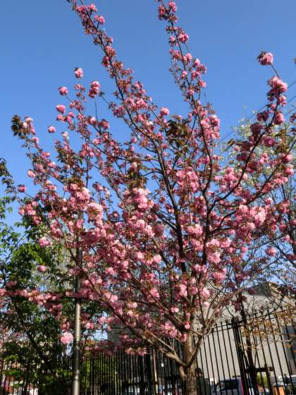 写真は学校の前庭〜御池通沿いの植栽です。一気暖かくなり,八重桜・ハナミズキ・皐が満開となっています。