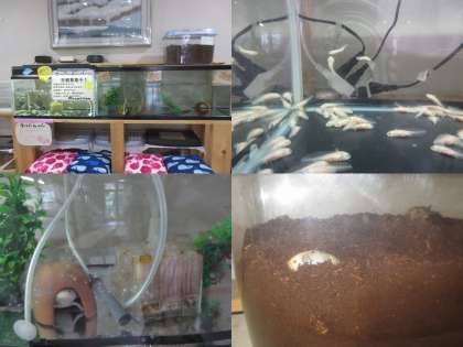また,水槽の上では,カブトムシの幼虫(中に十数匹います!)も育っています。ときおり土の上に出てきて,姿を見せてくれます。