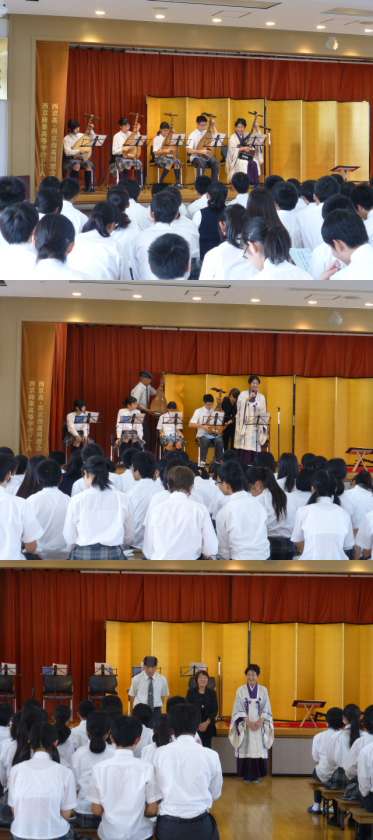 本日9月30日(金)5限、筑前琵琶橘流日本橘会師範の谷口旭佳氏をお迎えし,筑前琵琶の解説と「平家物語—『扇の的』『祇園精舎』」の解説・演奏を聴きました。また、しっかりと声を出して群読もおこない、代表の生徒4人が琵琶の演奏体験をしました。国語の授業で学習もしましたが,生の演奏と語りによって原作の生き生きとしたリズムや言葉の美しさを改めて体感することができました。