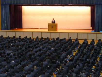 校歌斉唱の後,学校長が出張で不在のため、西京高等学校 田頭副校長先生から中1から高3まで約1,200人の生徒を前に話がありました。前後期の切り替えのこの時期をよい機会として、今やるべきことは何なのか、各自が後期に向けての目標をしっかり持つようにしてください。また、社会にはいろいろな人がいる中で、いわゆる他者理解がしっかりできてほしい。公共交通機関における乗車マナーなどもしっかり守ることを改めて意識してください。いじめもしないことはもちろん、許さない気持ちを強く持って学校生活をおくってほしいと思います。