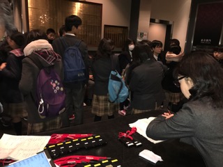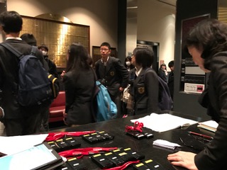班毎にツアーデスクでチェックを受けて、それぞれ、企業訪問、異文化交流に出発しました。