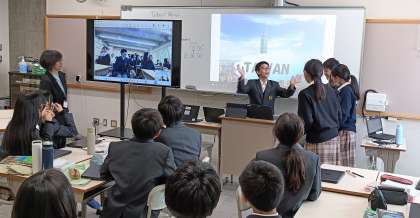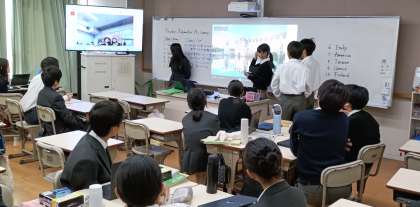 英語科の授業で教室と小演習室をオンラインでつなぎ、Microsoft Teamsを活用したプレゼンテーションを行いました。生徒たちは海外の様子を紹介しながら、適宜質問を投げかけ、相手の答えを受けてプレゼンを進めます。聞き手も身振り手振りを交えながら、英語で即応するなど、活発なやり取りが見られました。
