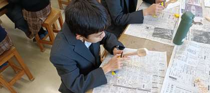 美術の授業では、木製のスプーンを制作しています。生徒たちは直方体の木材に鉛筆で下書きをし、その形を目安に小刀で丁寧に削り出していきます。まだ小刀の扱いには慣れていませんが、真剣な表情で一つひとつの工程に取り組む姿が印象的です。それぞれが創意工夫を凝らし、個性豊かな作品に仕上がりつつあります。温かみのあるスプーンが並ぶ日が楽しみです。