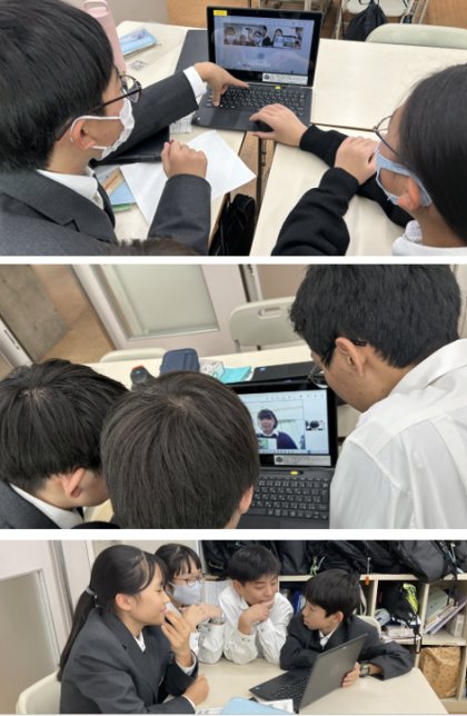 オンラインでやり取りをしました。画面上での英語でやり取りは、実際面と向かってするよりも、制限があって少し難しそうでした。また即興で返答する必要があって、身振り手振りを交えながらも、空白の時間を作らないようお互いが協力してやり取りしている姿がほほえましかったです。これからの時代、Web会議は当たり前になってくるでしょう。その中で英語でのコミュニケーションが必要になってくることも多々あると思います。今日の感覚を忘れず、さらにスキルアップしていって下さい。
