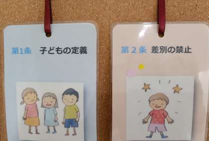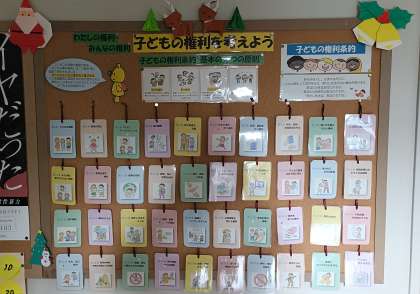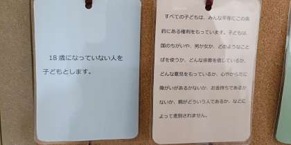 保健室前に「子どもの権利」に関する展示を行っています。そこには、子どもの権利条約に基づく40の権利が書かれたカードが並んでいます。カードの裏側には、それぞれの権利についての説明が記されています。