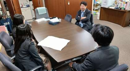 M9実行委員会から委員長と副委員長、しおり担当者が本日昼休みに校長室を訪れました。しおりの巻頭の言葉を校長先生にお願いしに行ったところ、快く受けていただけました。加えて、実行委員への激励をいただきました。ありがとうございます。