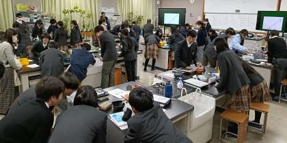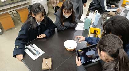 光が直進する様子を前回の実験で確認しました。今日はその光が曲がる様子を観察しました。鏡での反射や水面での屈折など、知っているものの実際に観察すると歓声が起きていました。今日は終日授業参観で保護者の方が多く来られていました。理科室では一緒に実験に参加していただきありがとうございました。器のそこにコインを入れ、ぎりぎり見えない位置にまで視線を下げ、器に水を入れていったときの見え方について観察をしました。水を入れていくと徐々にコインが見えるようになって、生徒だけでなく保護者の方からも歓声が起きていました。