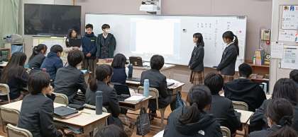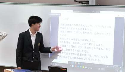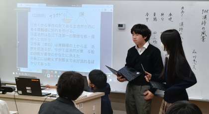 各班ごとに漢詩を分析し発表しました。春暁、絶句、黄鶴、春望について、個性的な視点で考察を深めました。李白と孟浩然の関係性はどうなのか、いつどこで出会ったのかなど、背景を調べながら独自の分析を披露します。それぞれの漢詩を読み込んでいるので、各発表に対して、新たな視点に感心したり自分とは異なる読みに思考を巡らせている様子が見られました。