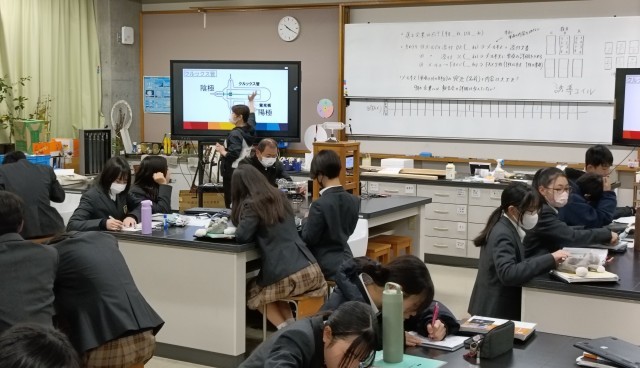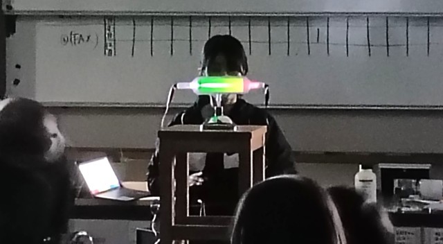 クルックス管を用いて電流の流れを観察する実験を行いました。ガラス管内を高い真空状態にし、電圧を加えることで、目に見えないはずの電子の流れが緑色の光として現れる様子を観察しました。陰極から発生した電子が直進し、磁石によってその進む道筋が曲がることから、電流が粒子の流れであることを実感をもって理解する貴重な機会となりました。日常では見えない現象を視覚的にとらえることで、科学への興味や探究心をさらに深める学びとなりました。