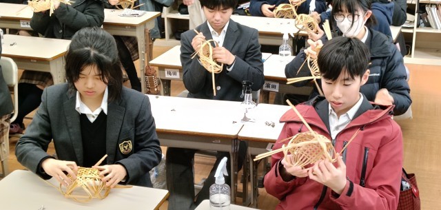 京都竹材商業協同組合より6名の工芸士の方々に来校いただき、竹かごの製作の指導を受けました。京竹工芸とは、京都産の良質な竹を活かし、茶道・華道具から日用品まで幅広く制作する伝統工芸で、地元竹の風合いと技を生かす点が特徴です。京都の伝統文化の継承を意識しつつ、身近なところに伝統文化があることのすばらしさに気づいてくれたことと思います。また実際に自分の手で作ることの難しさと竹そのものの美しさを実感したのではないでしょうか。今日作った竹かごはいろいろな用途に活用できます。ぜひ家で使ってみてください。