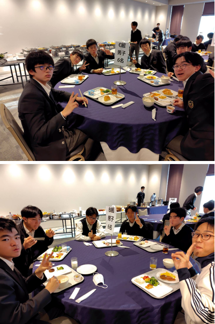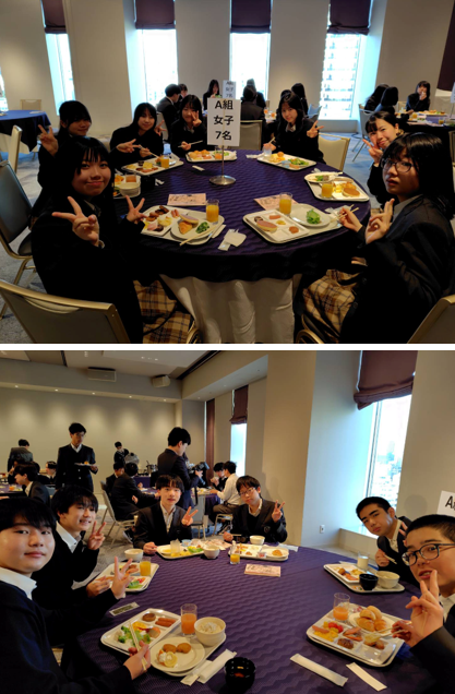 2日目も元気に過ごしています。朝食会場では少し眠たそうな生徒もいましたが、元気に集合し、7時20分より朝食をとっています。今日は班別研修があります。準備万端のことでしょう。楽しみです。