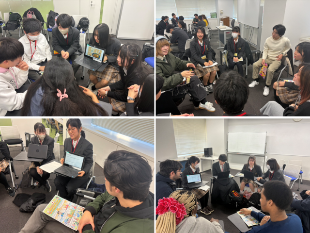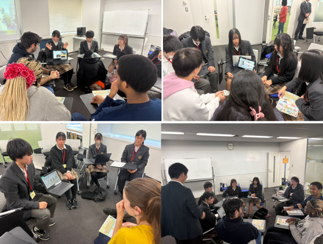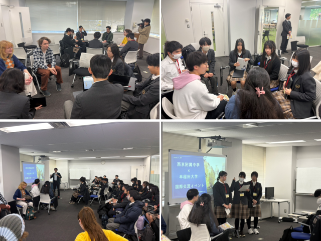 早稲田大学では、各グループ自己紹介から始まりました。京都や日本の文化や歴史についてパワーポイントを使って紹介しています。テーマ別ディスカッションでは、絶滅危惧種や災害対策、行ってみたい国などグループごとに即興でディスカッションをしています。留学生のみなさんが長期休業中などを利用して京都に旅行に訪れているそうで、生徒のプレゼンに興味津々でした。