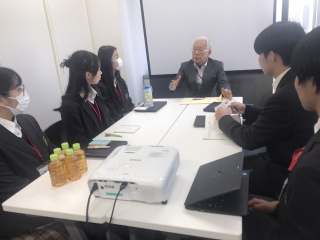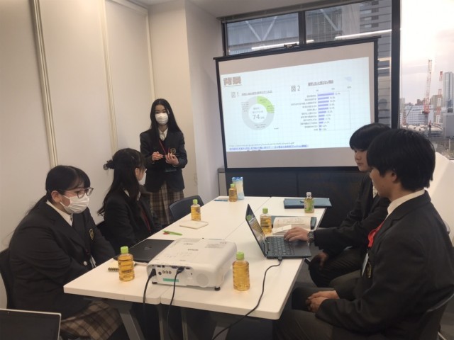 14班は株式会社アイエスエイを訪れました。「仮想留学すれば日本の子どもたちの選択肢が広がるのではないか。」という仮説を立て、プレゼンを行いました。創業者の代表取締役会長から直々に創業の熱いお話を伺うことができました。生徒たちも学校の説明や仮説に対する提案を熱く語りました。ディスカッションでは20年後の未来をイメージしながら、社員のみなさんとともに仮説をブラッシュアップしました。