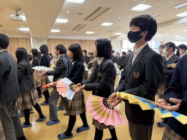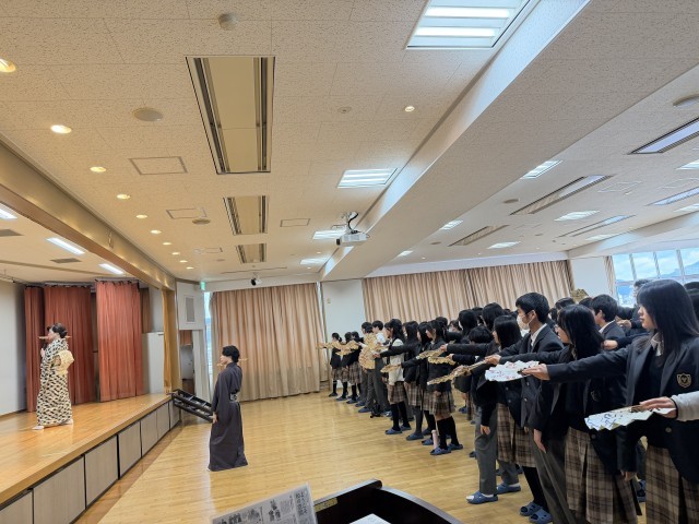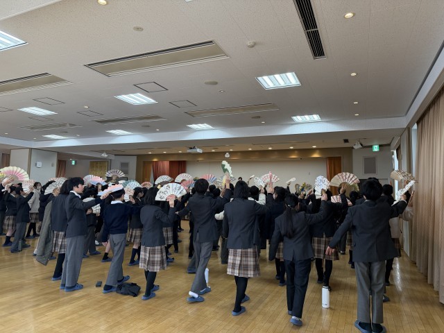 来週の「ようこそ和の空間 伝統公演鑑賞」を前に、日本舞踊西川流 西川鯉先生をお招きして事前学習を行いました。歴史や扇子の扱い方を教えていただき、後半の体験では「さくらさくら」に合わせて実際に踊りにも挑戦しました。一人一人が扇子を持って、西川先生のご指導のもと、扇子の動きや目線、足さばきなど見様見真似で取り組みました。はじめはぎくしゃくした動きも、練習を重ねるたびにスムースになり、初めての日本舞踊に笑顔が生まれていました。来週10日(火)の午前中に能楽堂で行われる公演がますます楽しみになりました。