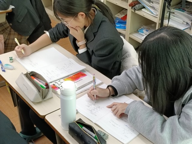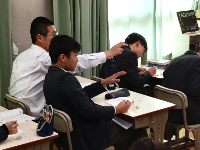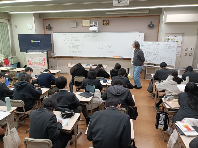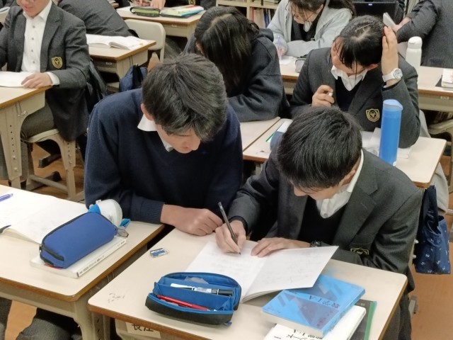 余弦定理からヘロンの公式を導く流れを、個々が食らいついています。文字が3つの式変形になかなか見通しが持てず、戸惑いがありましたが、時間が経つにつれ「やってみないと分からない」「無理筋かもしれないけど解き進めてみよう」と黙々と手を動かし始めました。公式は暗記してしまえば使い勝手がよく便利なツールです。一方で、その公式を導くのは得てして難しいことが多いです。公式の背景を知ることも大切です。また、泥臭い計算をする経験も大切です。導けたときに爽快感がありますよね。