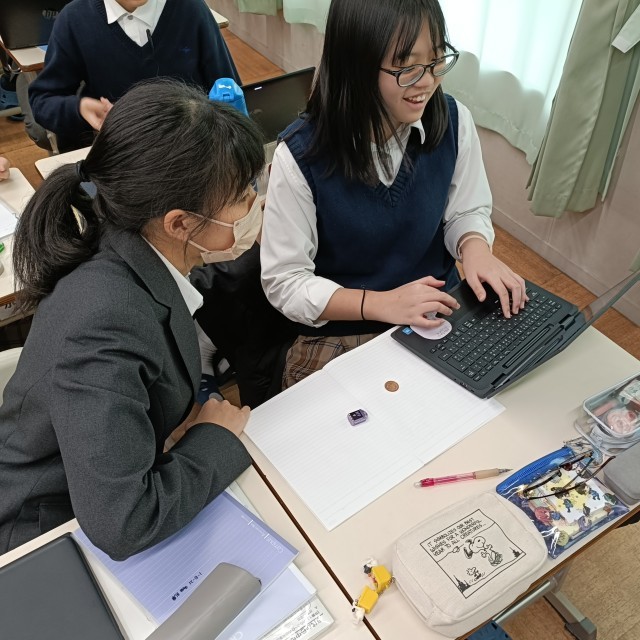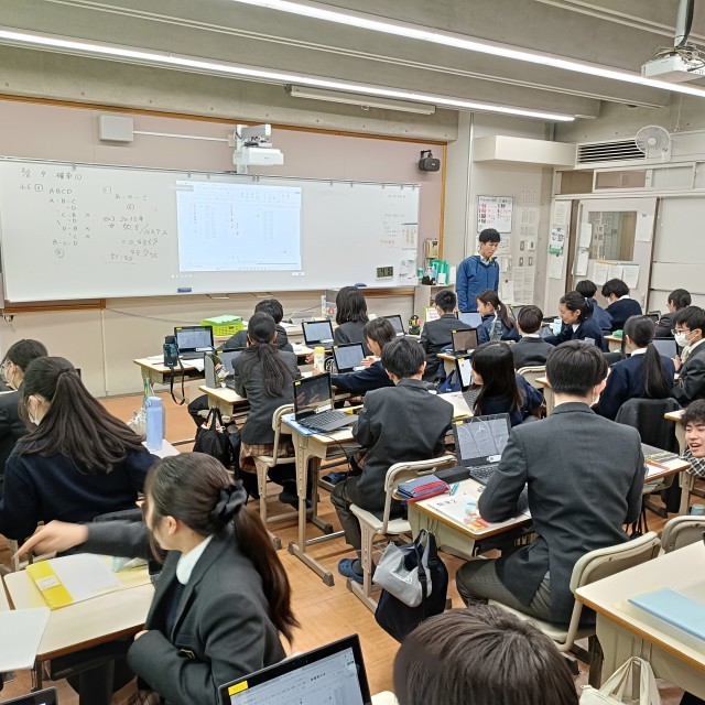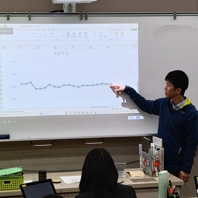 資料の活用の導入で、複数回試行を行いました。10円玉を投げたり、サイコロを投げて状況を記録しました。これを共有したExcelシートに入力しました。クラスの全員のデータを合わせていくと、値が一定値に収束していく様子がグラフで見てとることができました。予想通りの結果ではありますが、実際に値が落ち着いていく様子を見ると納得です。数学では「大数の法則」といいます。例えばさいころを投げたとき、「おおよそ6回に1回、1の目が出る」ことは経験的にも理論的にも理解はしていることでしょう。しかし、「5回投げて,1の目が1回も出なかったとすれば,次に投げると必ず1の目が出る」「6回投げるとき,そのうち1回は必ず1の目が出る」「6回投げるとき,1から6までの目が必ず1回ずつ出る」「30回投げるとき,そのうち1の目は必ず5回出る」という選択肢を正しいと考える生徒が少なからずいます。難しいところですが、本質を理解できるよう努めましょう。