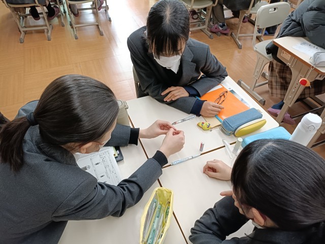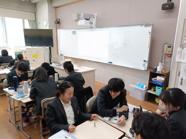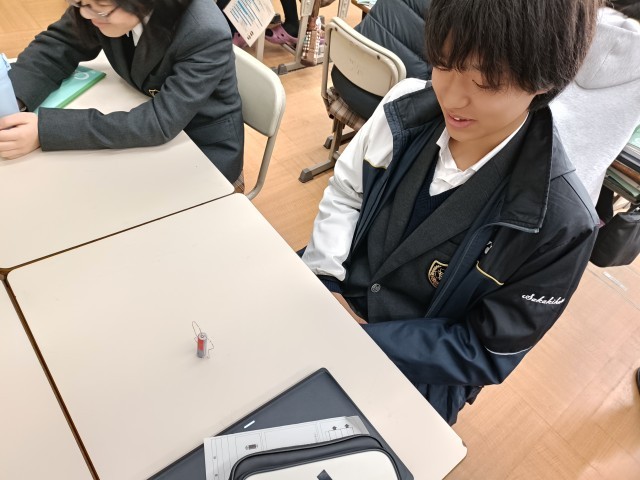 単極モーターとは、電池・磁石・導線の3つだけで回る最も単純な構造のモーターです。電池の電流が磁石の磁場を受けて力が生まれ、導線が回転します。作るポイントは、導線をバランスよく曲げて回りやすい形にすること、電池と磁石の接点をしっかり合わせて電流が流れるようにすること、摩擦を減らすことです。仕組みが簡単な分、接触や形のわずかな違いで回転しなくなるため、細かい調整が大切です。銅線と磁石と乾電池を用いて、どうやったら導線が動くのか試行錯誤をしています。銅線の形や磁石の位置など、班でいろいろな方法を模索していました。くるくると動き出すと歓声が起きていました。