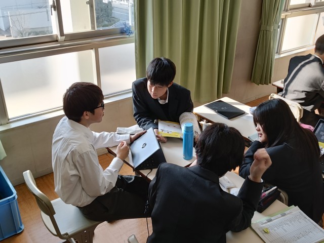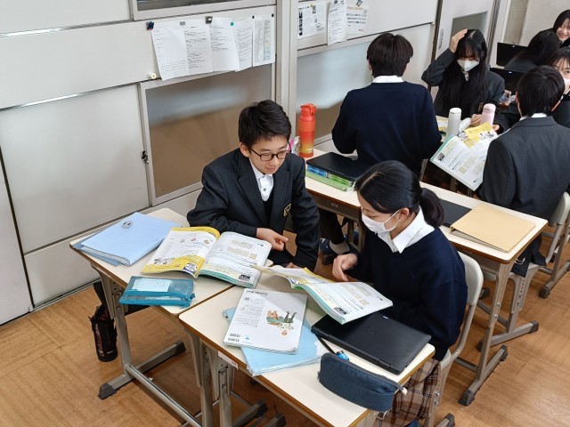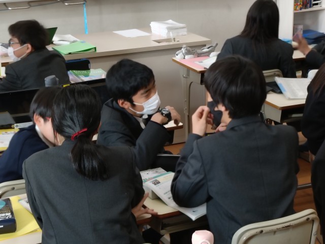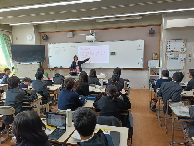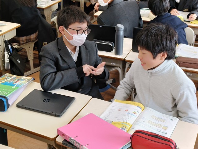 二人一組になってsituation speechを行いました。母と子に分かれ、いろいろな場面設定の下、英語で即興のやり取りを行いました。例えば、朝起きたらしんどくてお母さんに「学校休みたいアピール」をする私を演じます。理由は頭痛です。身振り手振りを交え、表情豊かに会話を楽しんでいました。まだまだ拙い英語ではありますが、なんとか相手に伝えたいという思いがあります。実践力が身についてきましたね。