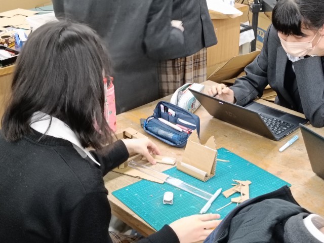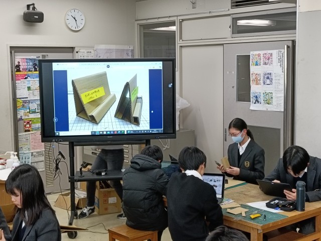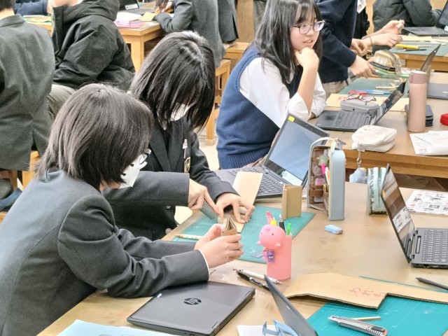 コンピュータで動物の名刺を作る作業を終え、それを置く台を作り始めています。名刺はオリジナリティを意識し、動物の「名前」が見えやすいような配色の工夫がなされています。名刺立ての作成では、段ボールを名詞の動物に合わせた形に作るなど様々な工夫がなされていました。完成が楽しみです。