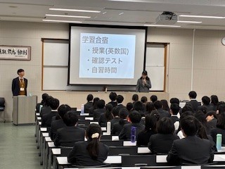 また、説明の最後には、外進生と内進生との交流を深めるための 「おでむかえキャスト」 や、学習合宿を支える スタッフ募集の案内もあり、生徒たちは積極的に参加してみようと意欲を高めていました。