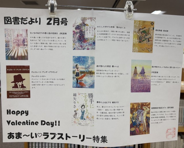 図書委員会から図書だより2月号が発刊されました。図書館に大きく掲示されていますので、ぜひ見に行ってください。ハッピーバレンタインと題し、選りすぐりの甘いストーリ本が紹介されています。みなさんは日ごろどんな本を読んでいますか?