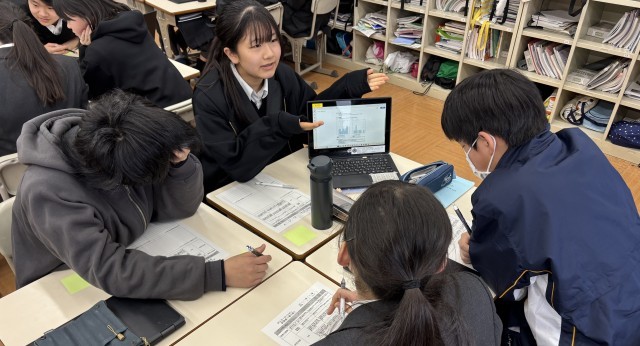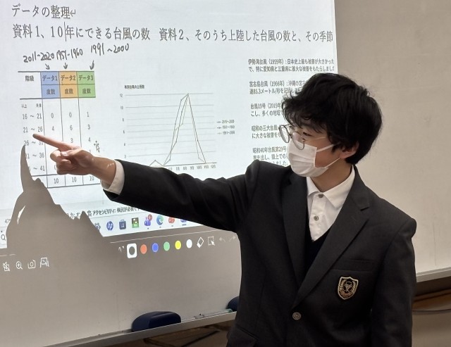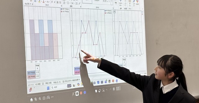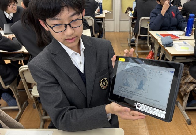 25日(水)に1年数学「データの活用」の単元の総括として、自分で収集分析したデータをまとめたものを相互発表しました。班で3分間発表した後、代表者がホワイトボード前で発表しました。ヒストグラムや度数分布表、代表値など多様な視点で丁寧に分析結果を伝えようと努力している姿が見受けられました。