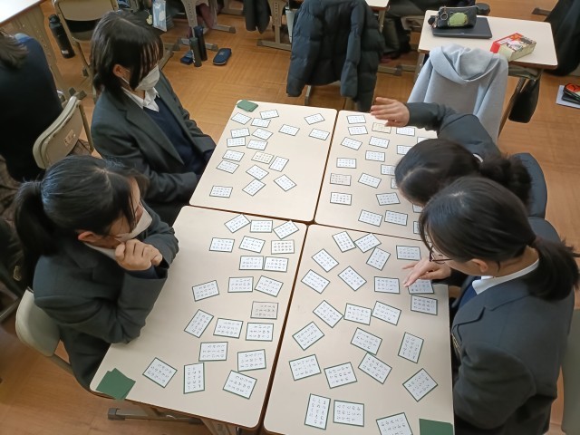 2年生の国語の時間で久しぶりに百人一首に取り組みました。授業で習っている古典の延長としての扱いですが、みなさん大盛り上がりでした。先生が読まれる上の句の途中で、すでに手を伸ばし取る生徒もいれば、下の句が読み終わってもどこだどこだと探すチームもありましたが、みな笑顔で取り組んでいました。